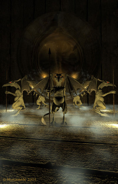 | Software/Logiciels: Poser 4 & Bryce 5 Models/Modèles: Gargoyle from/Gargouille de DAZ3D Spear by/Lance par Gary Vennié Materials/Textures: Original textures for the gargoyles; Lemog for the floor and walls; and my own for the spear./Textures d'origine pour les gargouilles, Lemog pour le plancher et les murs; et les miennes pour la lance. | |