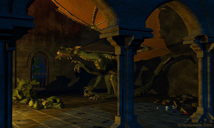 | Software/Logiciels: Poser 4 & Bryce 5 Models/Modèles: Millenium Dragon, Hatchling Dragon & Gothic Construction Set from/de DAZ3D Skeleton which comes with Poser/Squelette fourni avec Poser Curious Labs Sword by/Épée par Gary Vennié Materials/Textures: Original textures of the/Textures d'origine des Millenium Dragon, Hatchling Dragon & Gothic Construction Set | |